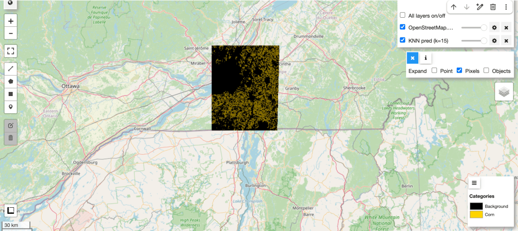 Apply the trained KNN model to Southern Ontario, Canada, demonstrating how the model extends detailed crop classification beyond the U.S.
