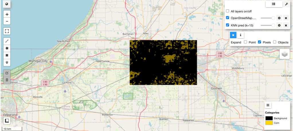 Train the KNN model in Colab using USDA NASS CDL data from Ann Arbor, MI, then test and visualize predictions for South Bend, IN.