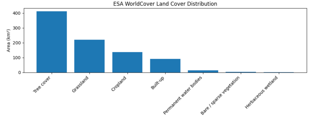 Display a bar chart summarizing land cover categories by area (km²), such as tree cover, grassland, and cropland, to improve interpretability.